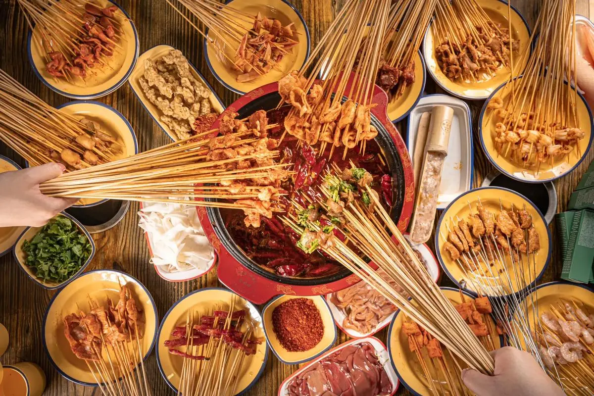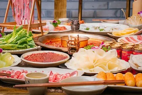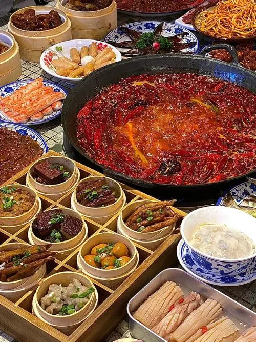 A spicy and flavorful hotpot experience is a must in Chengdu. It is a communal meal where a simmering pot of spicy broth is placed at the center of the table, and diners add various ingredients such as meats, vegetables, noodles, and tofu to cook in the pot.