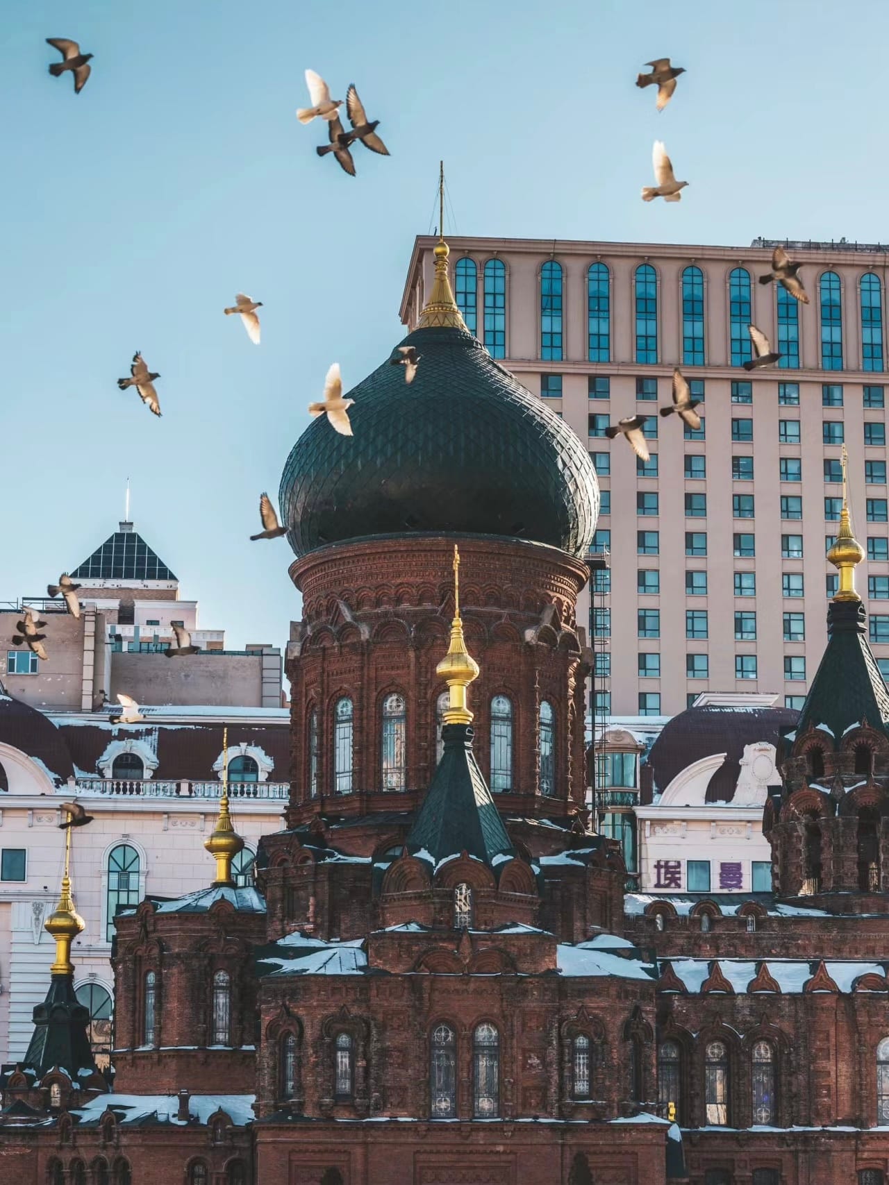 Saint Sophia Cathedral, originally built in 1907, is one of Harbin’s most iconic landmarks, with its striking green onion-shaped dome catching the eye. This magnificent Byzantine-style structure no longer functions as a church, and its nighttime illumination makes it even more beautiful. Once the largest Orthodox church in the Far East, Saint Sophia is now the most well-preserved Byzantine building in China. It has been converted into an art gallery, showcasing nearly a thousand photographs and a city planning model that reflect Harbin's past, present, and future. The square in front of the cathedral features a large series of musical fountains and is a popular spot for wedding photos, often with flocks of pigeons adding to the picturesque scene.