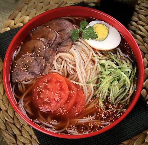 Cold noodles are a distinctive Korean-style dish, featuring a unique combination of flavor and texture. The main ingredients are buckwheat and starch. During preparation, these ingredients are briefly boiled in hot water, mixed with a bit of alkaline solution, and then cooled in cold water. The cold noodles are served with a variety of fresh vegetables and often accompanied by dog meat, all topped with a spicy garlic sauce, creating a delicious and refreshing meal.