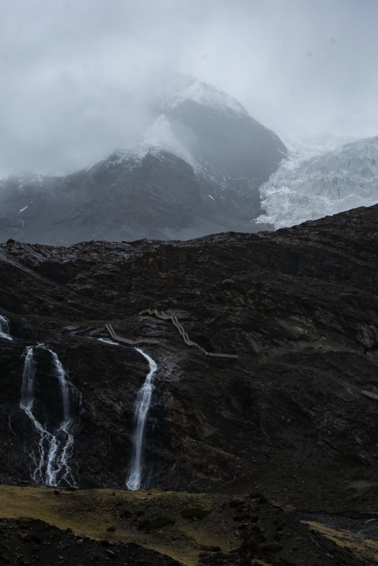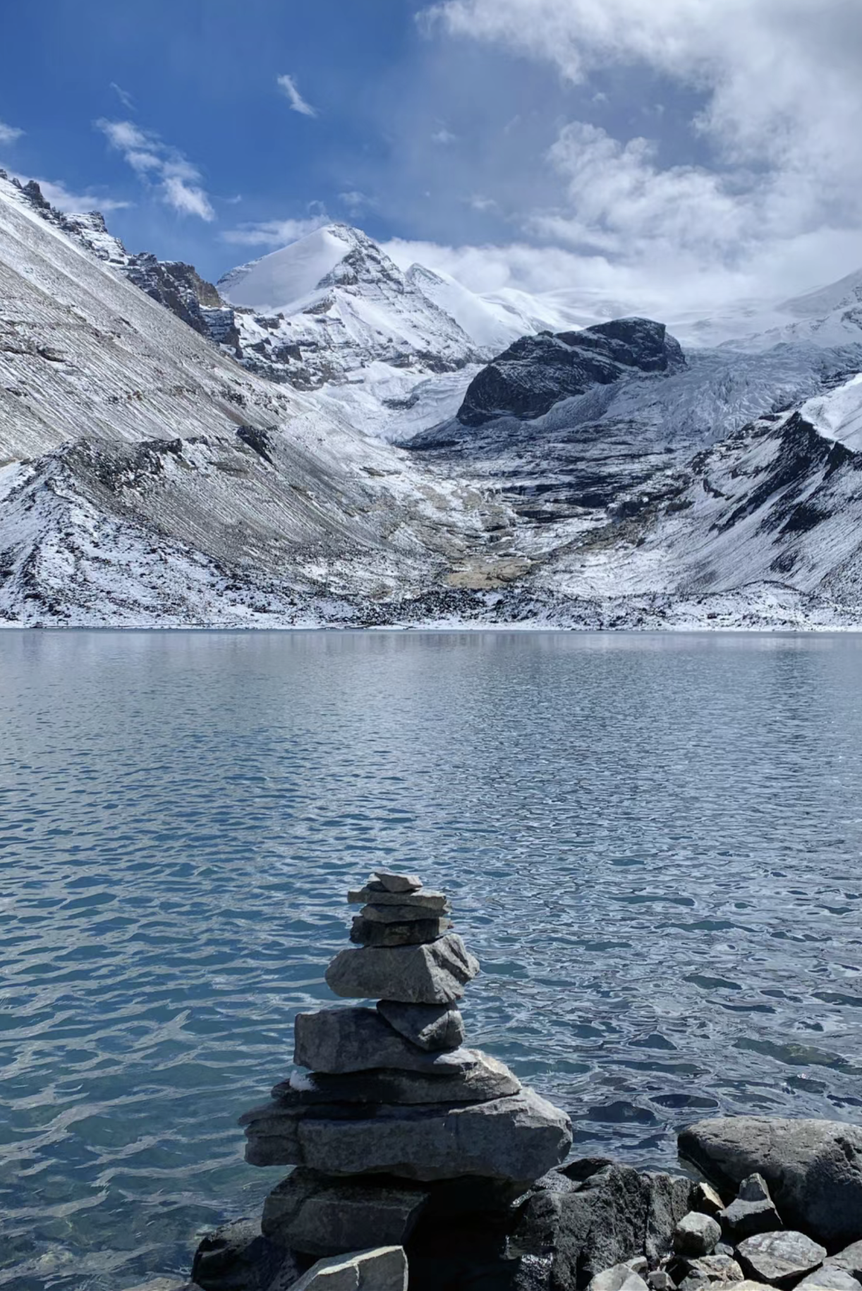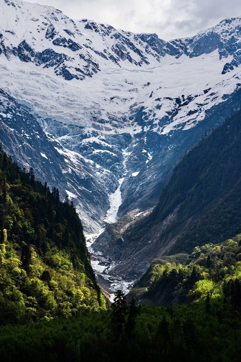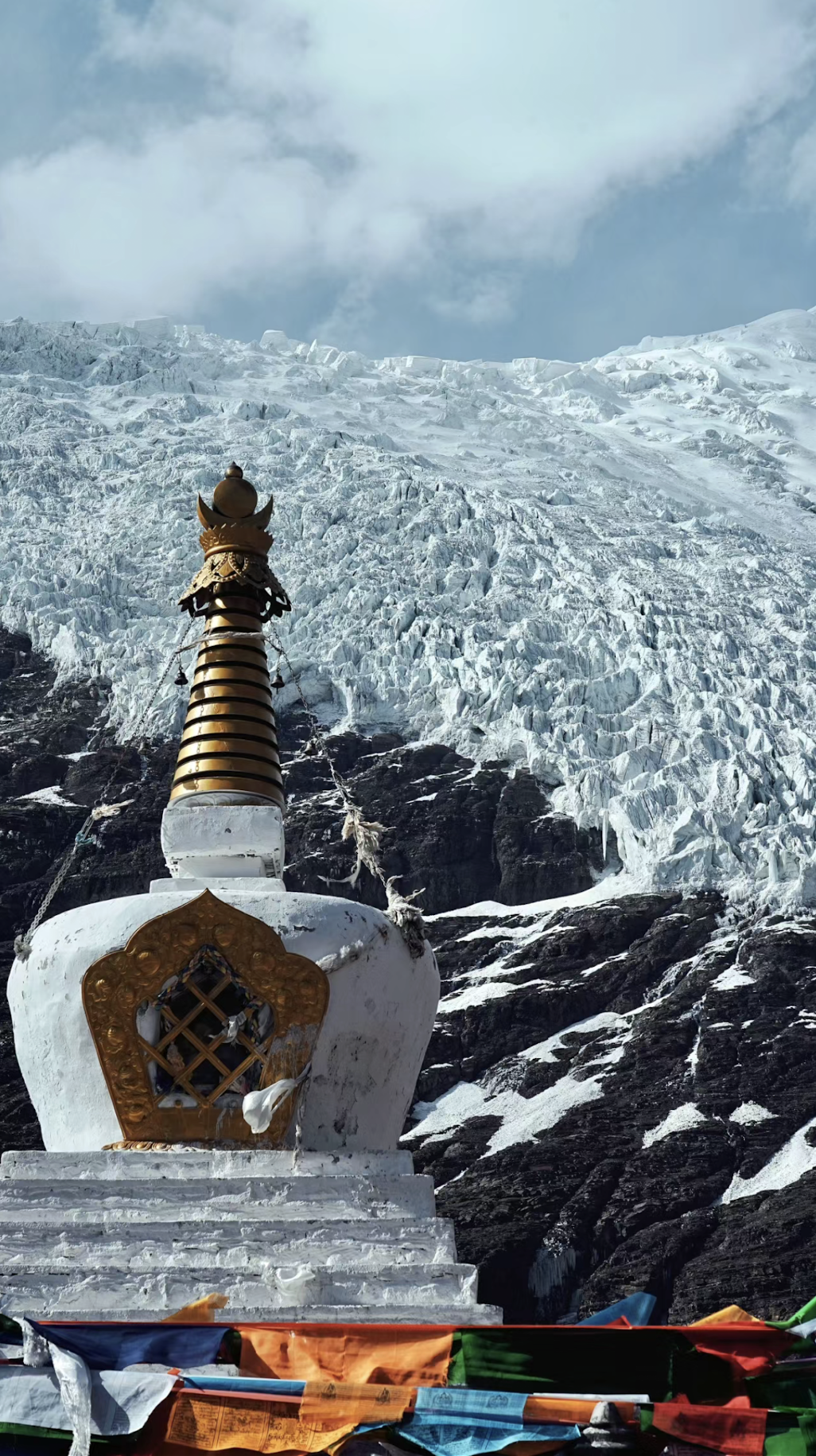 This glacier is close to the road and has been featured in films like Red River Valley and Clouds and Water. The massive glacier tongue extends down from the mountain, forming a striking contrast with the white snow. The jagged ice formations give it a powerful, awe-inspiring presence. There is a viewing platform set up by local Tibetans along the road for photography, with a fee of 50 RMB. Drivers familiar with the area often know of free yet equally spectacular viewpoints, so if you're on a carpool tour, your local driver might stop at one of these places for breathtaking views and photos.