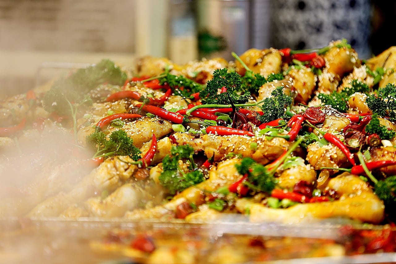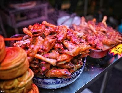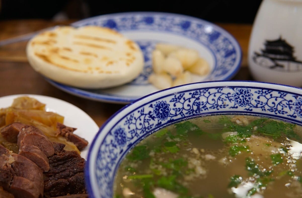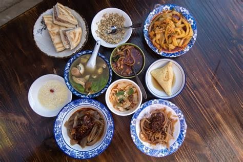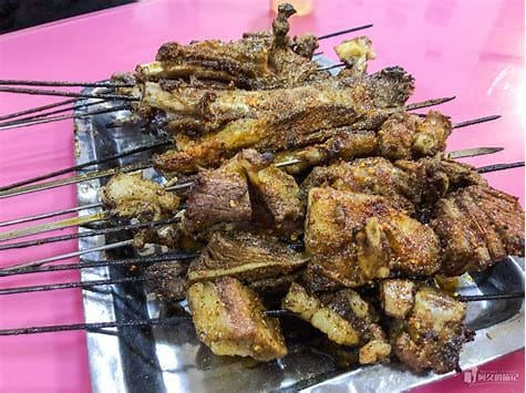 Famous dishes here include Lanzhou Beef Noodles (Lanzhou Niuroumian), Xinjiang Lamb Skewers (Xinjiang Yangrouchuan), Big Plate Chicken (Da Pan Ji), Roujiamo (Chinese Hamburger).