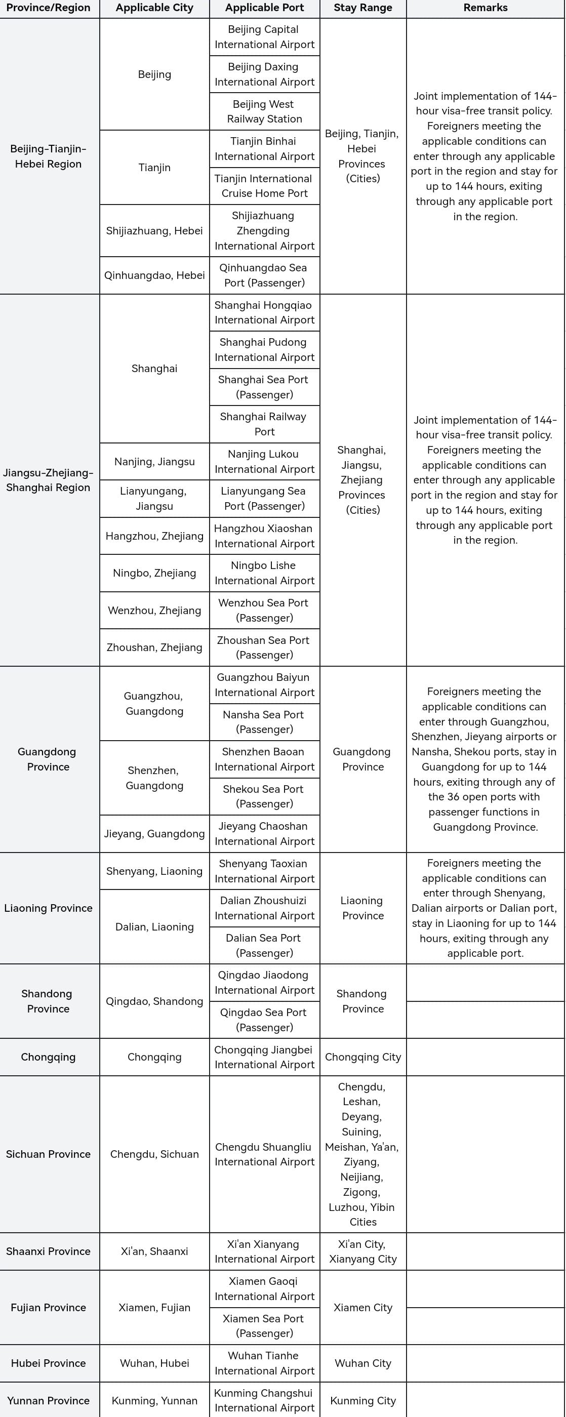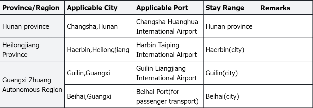 Visa-Free Cities and Corresponding Ports and Activity Limits (as of July 2024)