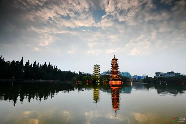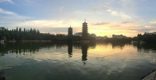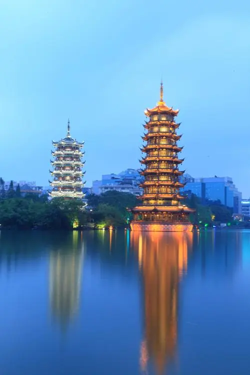 Relax at Ronghu and Shanhu Lakes, two of the four lakes in Guilin’s central area. The twin pagodas, the Sun and Moon Pagodas, are beautifully lit at night, providing a picturesque view as you stroll along the lakeside.