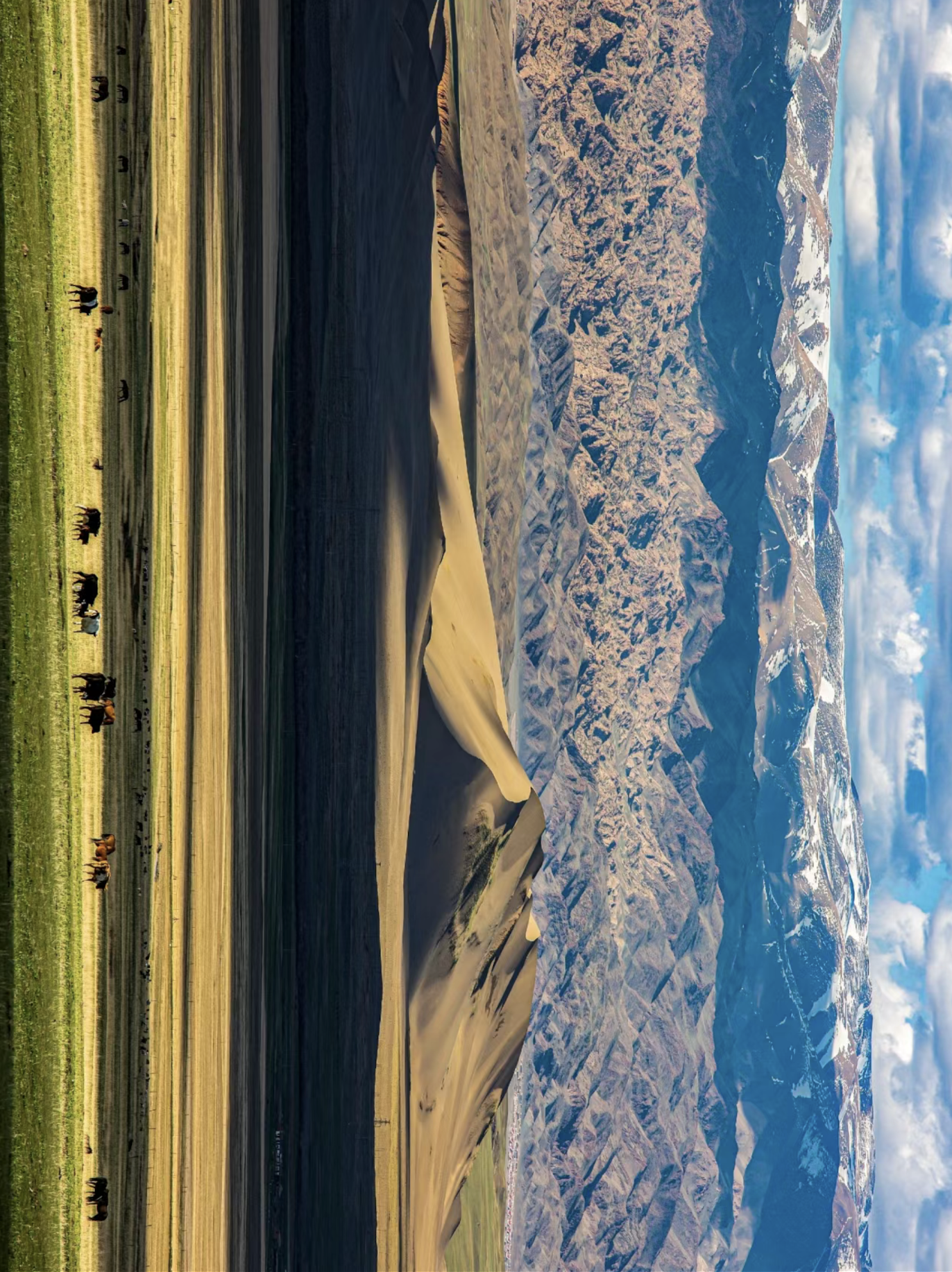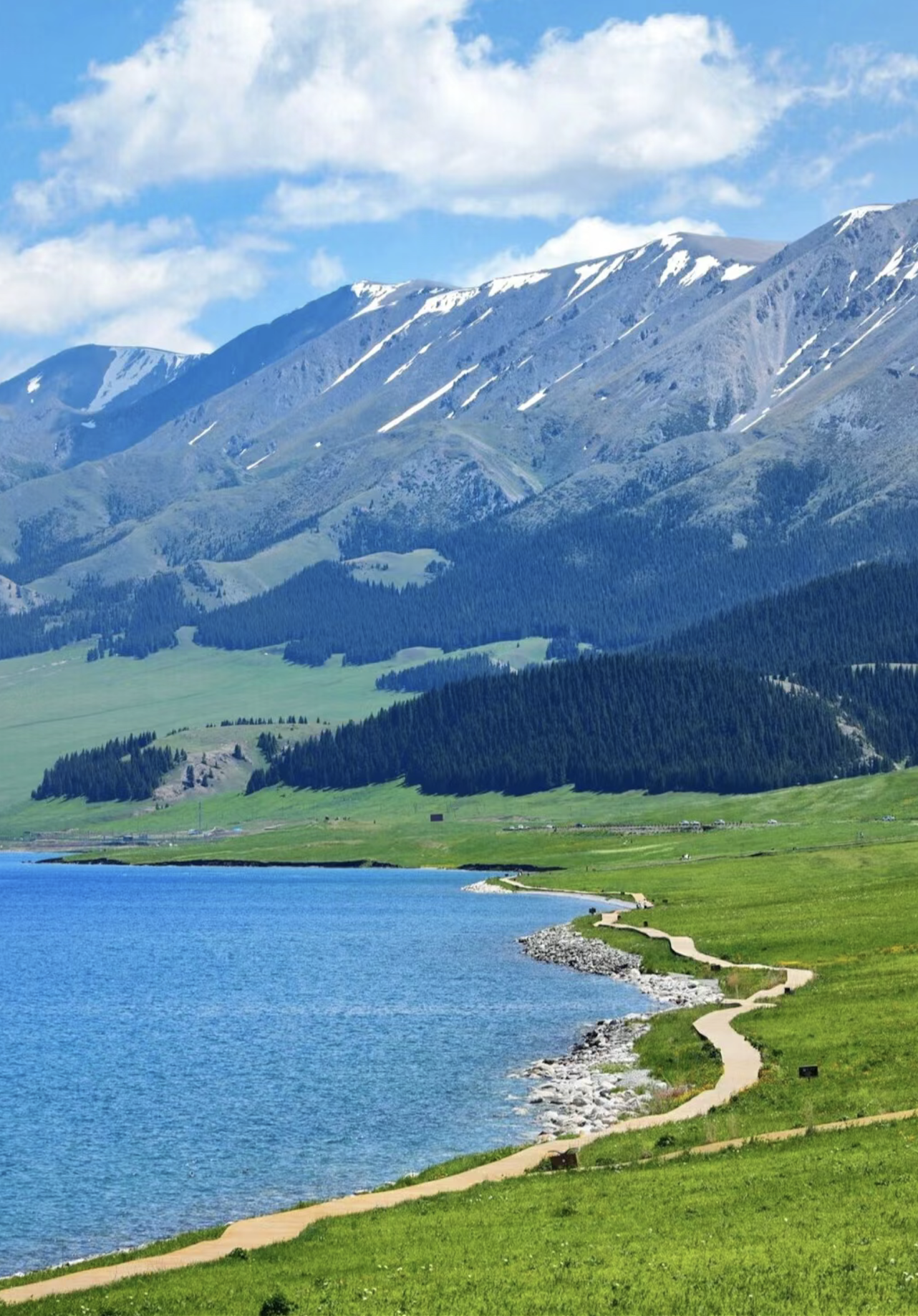 In contrast, Northern Xinjiang is more humid, thanks to the influence of moisture from the Atlantic Ocean and airflows from Siberia, as there is no mountain barrier. This climate supports the growth of grasslands, forests, and lakes, creating a lush natural landscape.